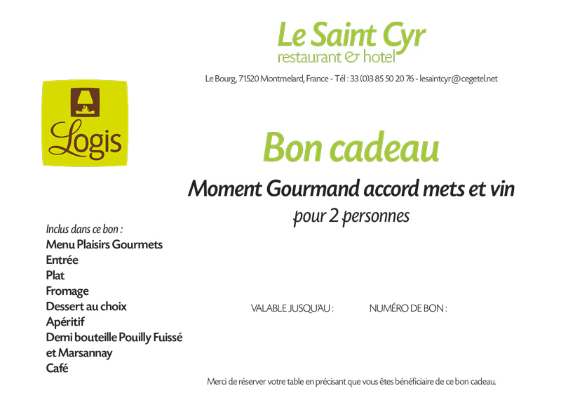 Inclus dans ce bon Menu Plaisirs gourmets Entrée, Plat, Fromage, Dessert au choix Apéritif maison, 1/2 bouteille Pouilly Fuissé et Saint Joseph, Café