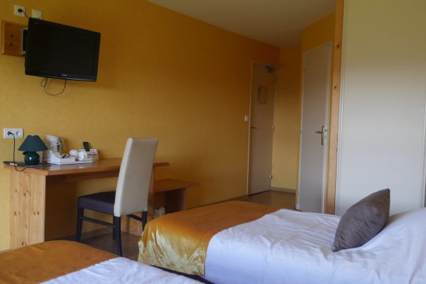 Chambre spacieuse aux tons jaunes et blanc, synonymes de printemps, avec vue sur le bocage contenant deux lits simples 100 x 200 cm, salle de bains avec douche, WC, sèche-cheveux et une fenêtre, bureau, WIFI, TV